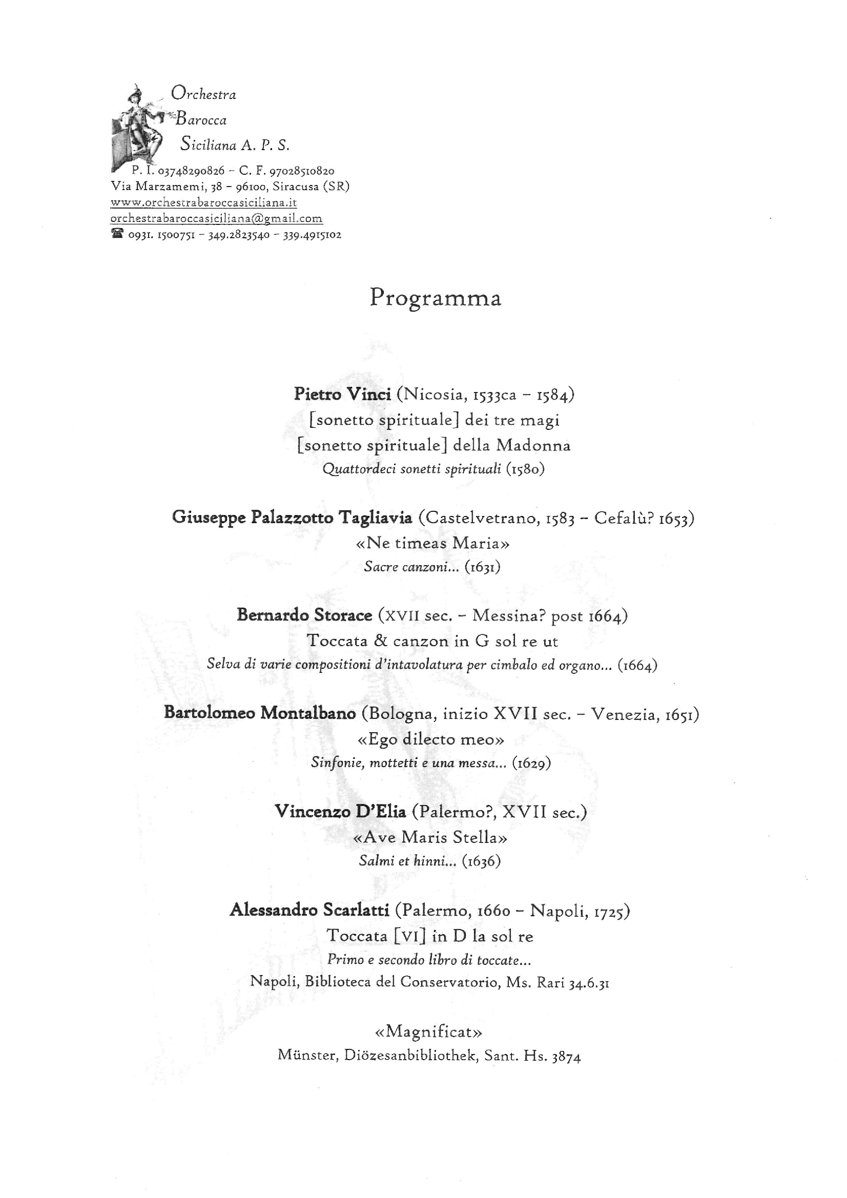 Nell'anno consacrato al compositore Alessandro Scarlatti il Consonanze Barocche Vocal Ensemble presenta il suo primo programma monografico, interamente dedicato alle Polifonie Sicule dal Rinascimento fino agli inizi del Settecento.
